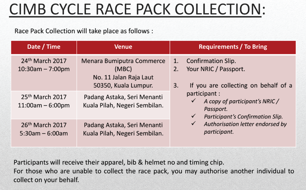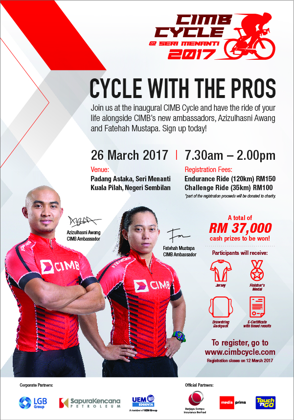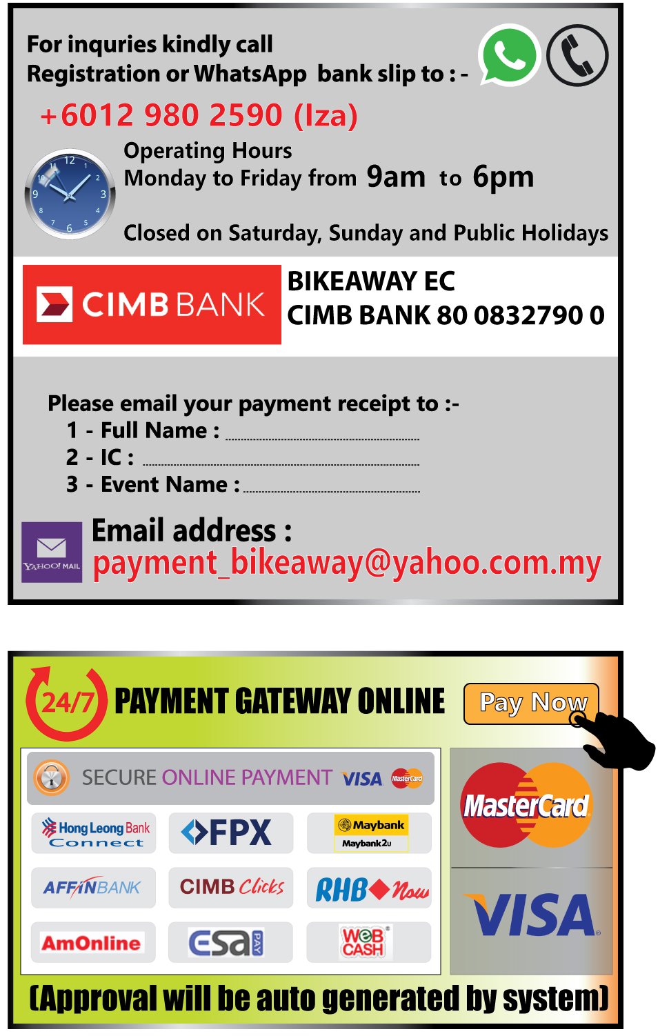 ** A portion of registration proceeds will go to charity. Registration closes on 12 March 2017. Category : ENDURANCE (Jersey) Category : CHALLENGE (Sublimation Shirt) FINISHER'S MEDAL : SLING BAG : ROUTE MAP & ELEVATION : Registration Contact +6012 9802590 (Iza) Email: payment_bikeaway@yahoo.com.my Account No : BIKEAWAY EC CIMB Bank : 80 0832790 0