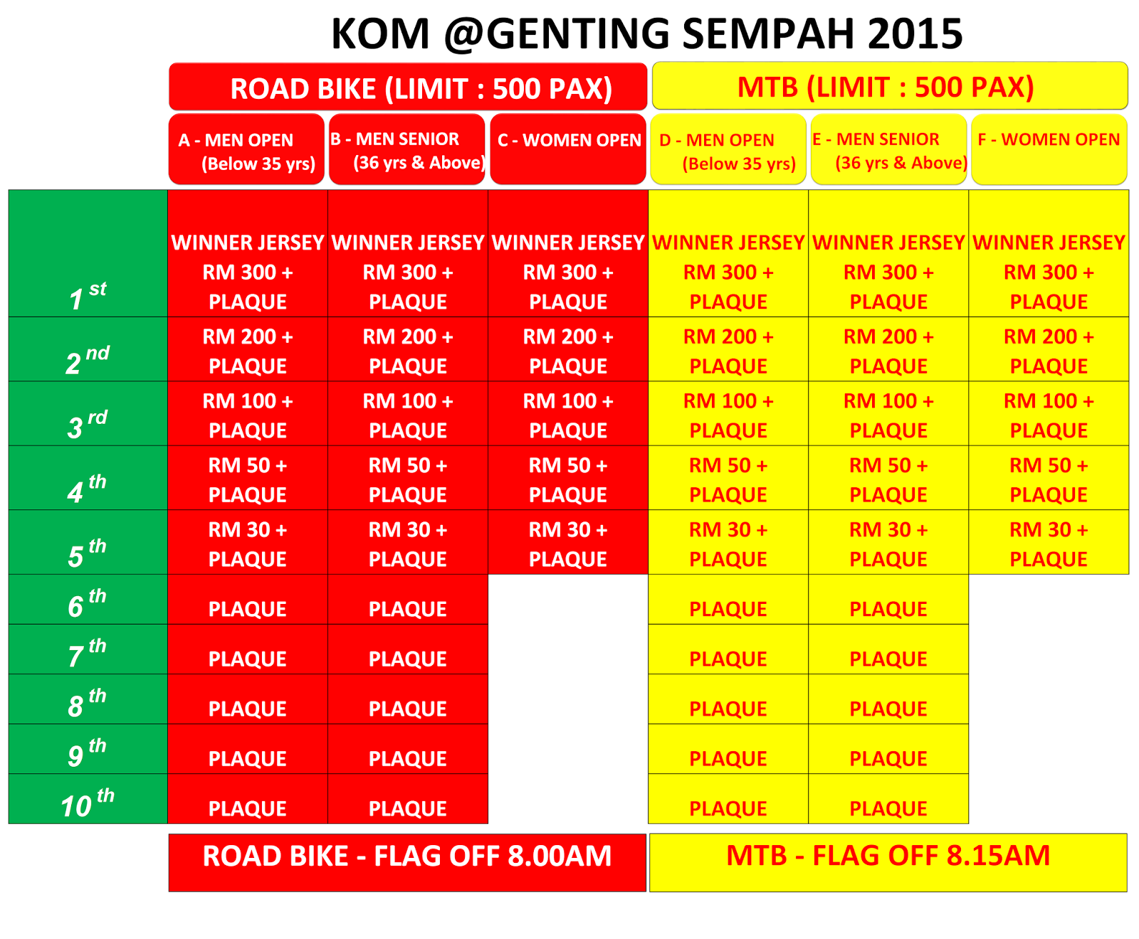 RM 80 + TIMING CHIP (Normal Price) (A) MTB/FB/HW/FAT Bike - Fat Bike Open - (RM80.00) (A) MTB/FB/HW/FAT Bike - Fat Bike Open - (RM50.00) (B) MTB/FB/HW/FAT Bike - Folding Bike Open - (RM50.00) (B) MTB/FB/HW/FAT Bike - Folding Bike Open - (RM80.00) (C) MTB/FB/HW/FAT Bike - Heavyweight MTB Open - (RM80.00) (C) MTB/FB/HW/FAT Bike - Heavyweight MTB Open - (RM50.00) (D) MTB/FB/HW/FAT Bike - MTB Men Open (35 years & below) - (RM50.00) (D) MTB/FB/HW/FAT Bike - MTB Men Open (35 years & below) - (RM80.00) (E) MTB/FB/HW/FAT Bike - MTB Men Senior (36 years & above) - (RM80.00) (E) MTB/FB/HW/FAT Bike - MTB Men Senior (36 years & above) - (RM50.00) (F) MTB/FB/HW/FAT Bike - MTB Women Open - (RM50.00) (F) MTB/FB/HW/FAT Bike - MTB Women Open - (RM80.00) (G) Road Bike - Road Bike Men Open (35 years & below ) - (RM80.00) (G) Road Bike - Road Bike Men Open (35 years & below) - (RM50.00) (H) Road Bike - Road Bike Men Senior (36 years & above) - (RM50.00) (H) Road Bike - Road Bike Men Senior (36 years & above) - (RM80.00) (I) Road Bike - Road Bike Women Open - (RM80.00) (I) Road Bike - Road Bike Women Open - (RM50.00) |