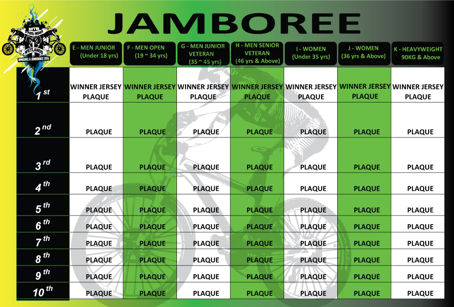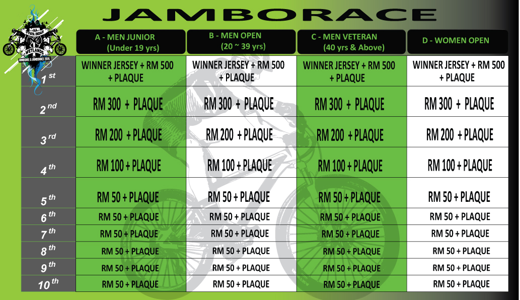 Special fees for : Category A (Race)- Men Junior (19yrs & Below) RM80 Category E (Jamboree)- Men Junior (19yrs & Below) RM70