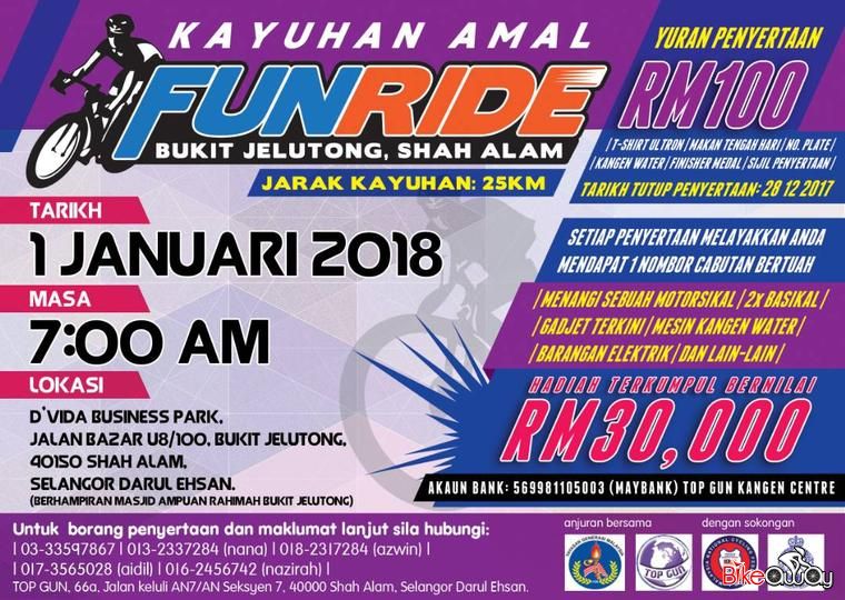 Selamat Tahun Baru 2018 Hadiah Besar Rm 30,000 menanti anda!!! Kayuhan Amal Funride Bukit Jelutong, Shah Alam Tarikh : 1 Januari 2018 Jam : 7 pagi Lokasi : D'Vida Business Park, Bukit Jelutong, Shah Alam Tel : 03 3359 7867 013 233 7284 (Nana) |  | |